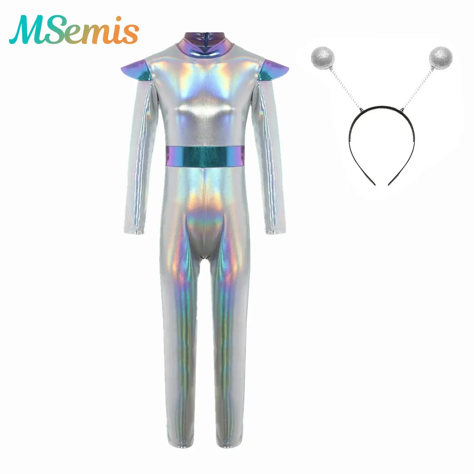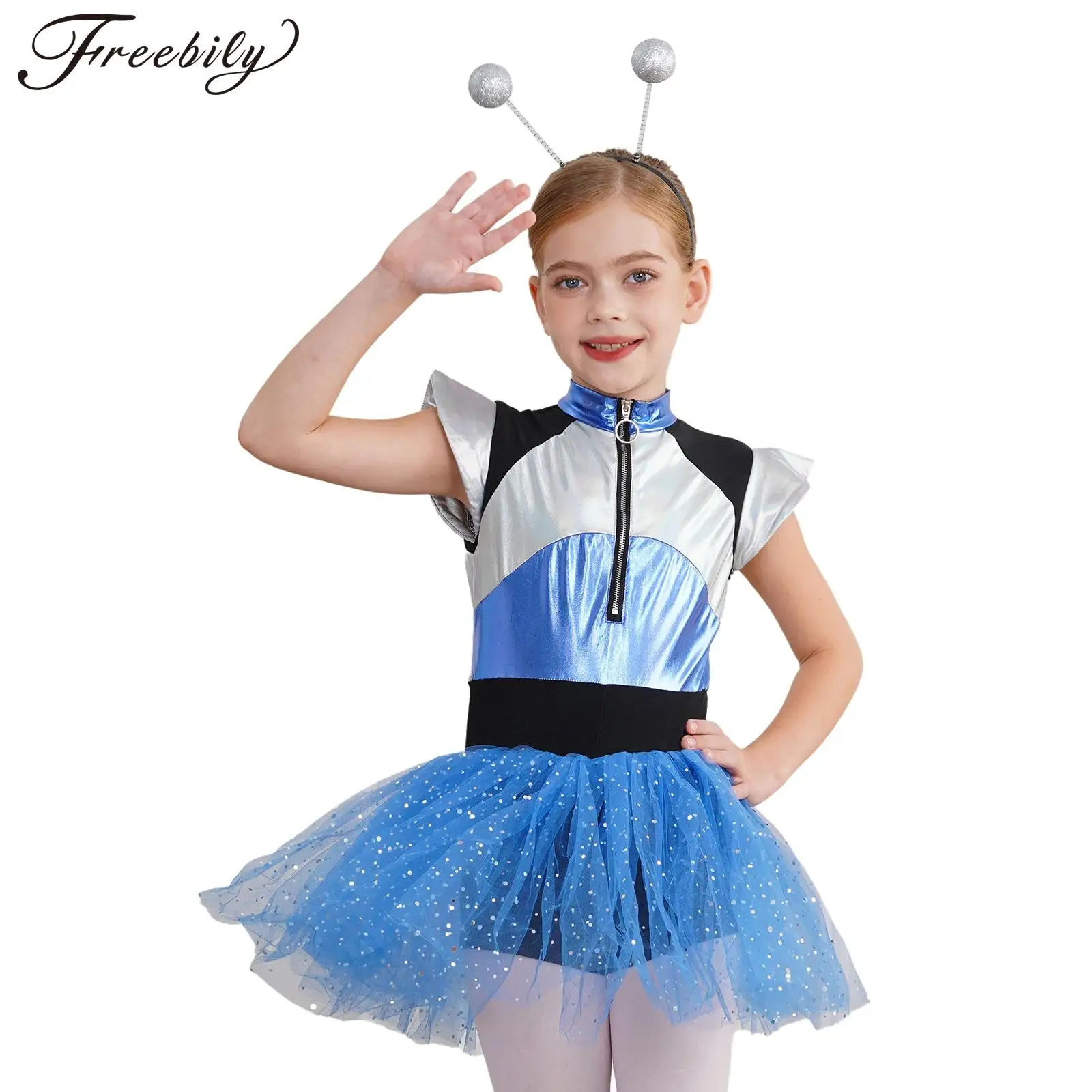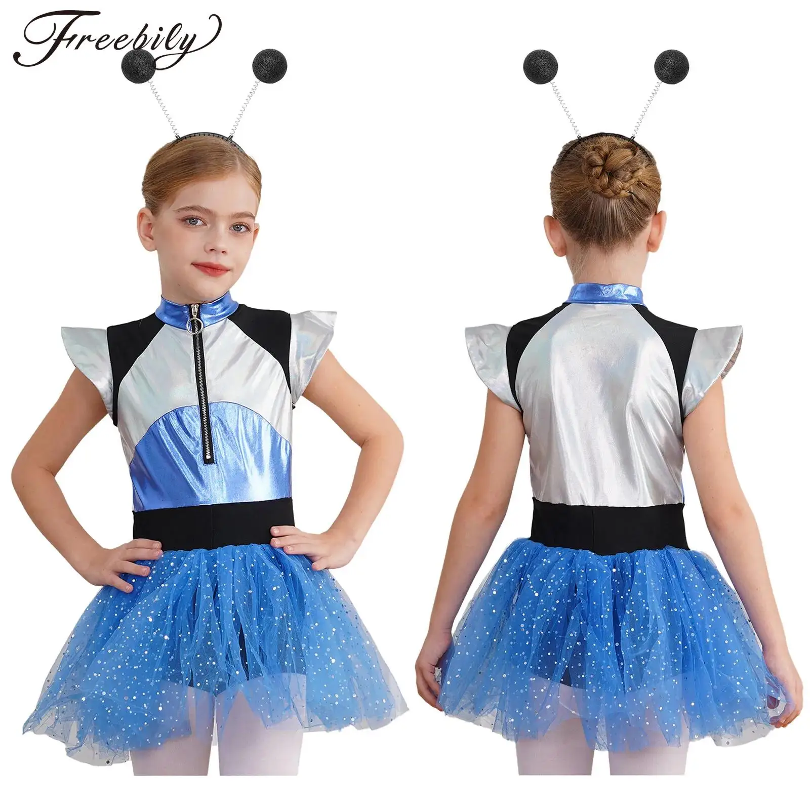Dívčí cizinec robot cosplais kostým lesklý spangles trikot šaty s cizinec vlasy obruč halloween sociální role divadelní hra kosmonaut kostým