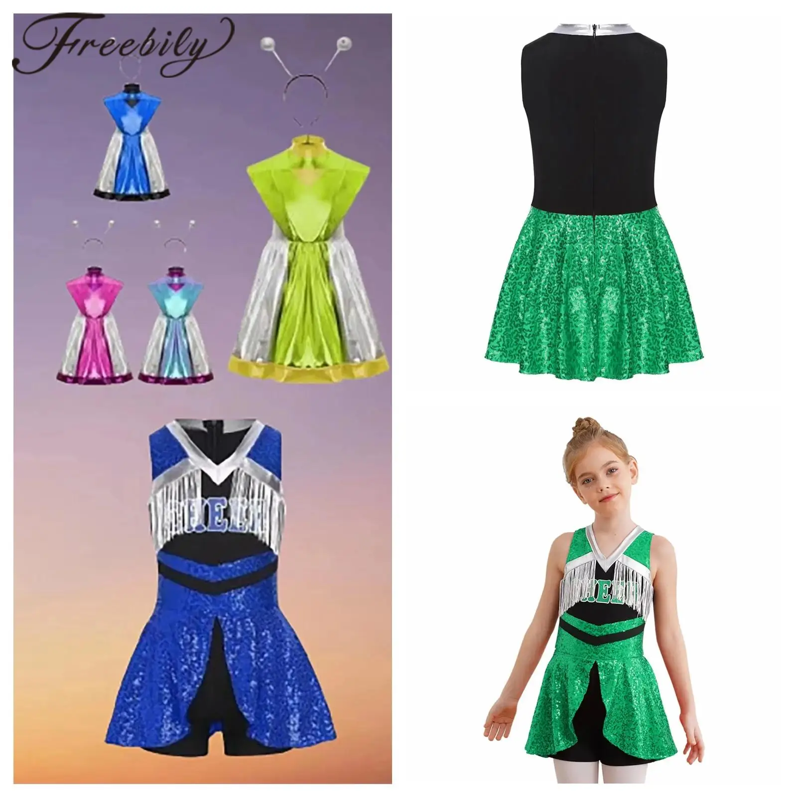 Děti dívčí lesklý metalické šaty vnější mezera cizinec robot cosplais kostým s vlasy obruč roztleskávačka halloween představení kostým