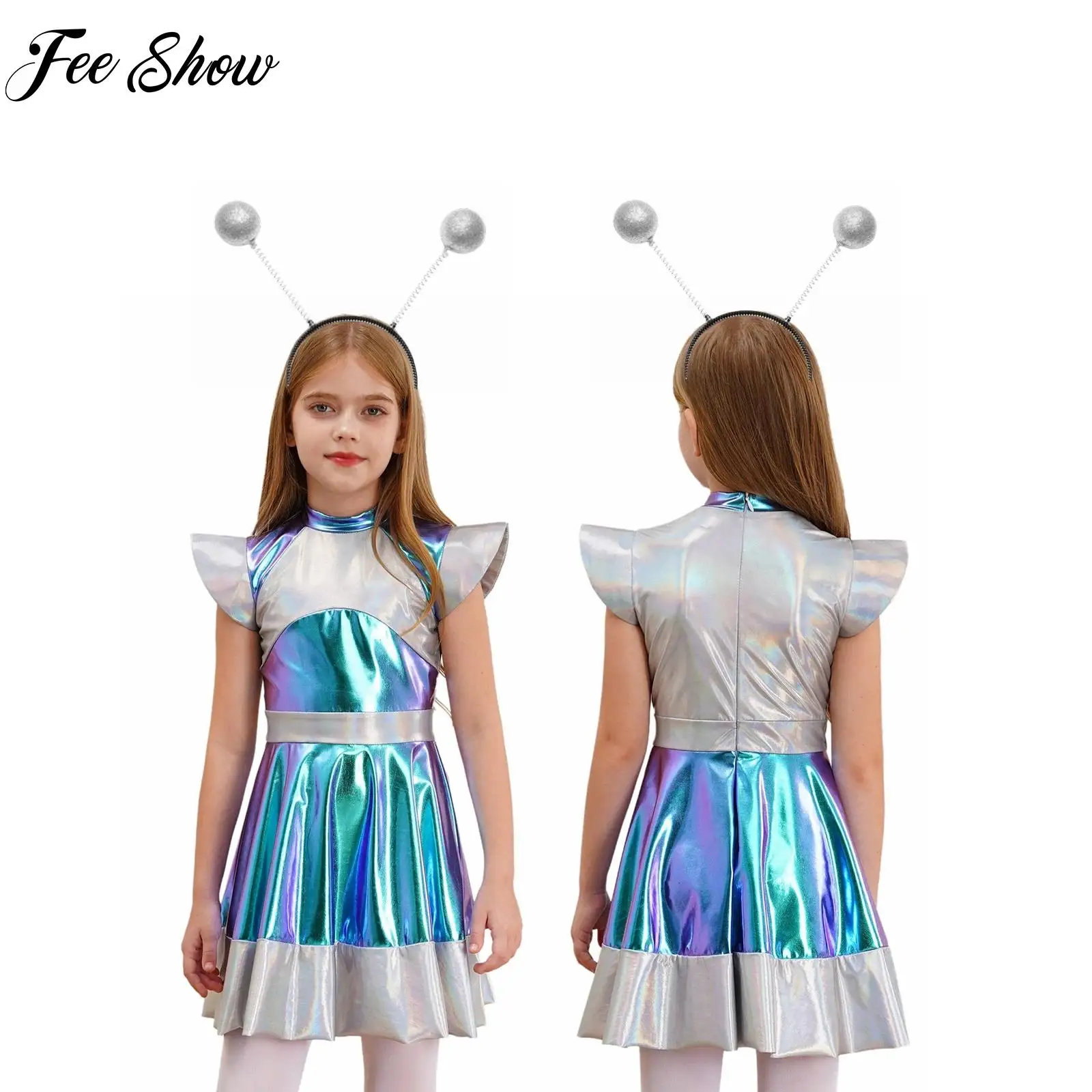 Děti dívčí halloween vnější mezera cutie cizinec cosplais kostým čepice rukáv metalické lesklý šaty s vlasy obruč pro škola ukázat