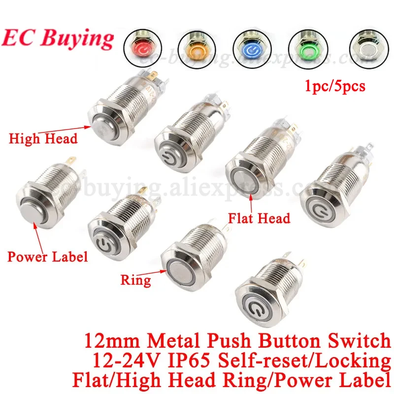 1pc-5pcs 12mm kov pushbutton spínač 12v 24v lehký spínač sebe resetovat aretace vodotěsný knoflík prsten energie symbolem momentální GQ12