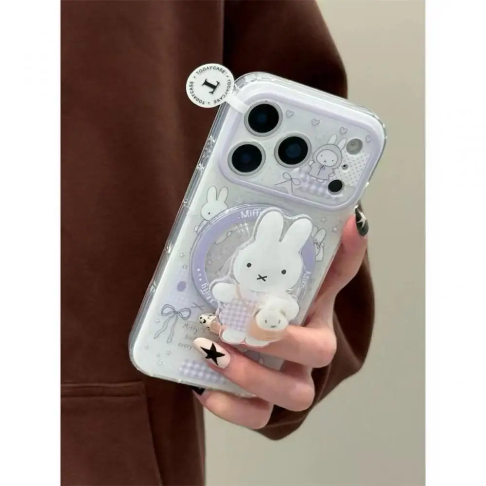 Roztomilá kreslený fialový stánek držák magnetický fundas pro iPhone 16 pro bezdrátový nabíjení pouzdro úchop tok skládací prst stánek nástrčkový