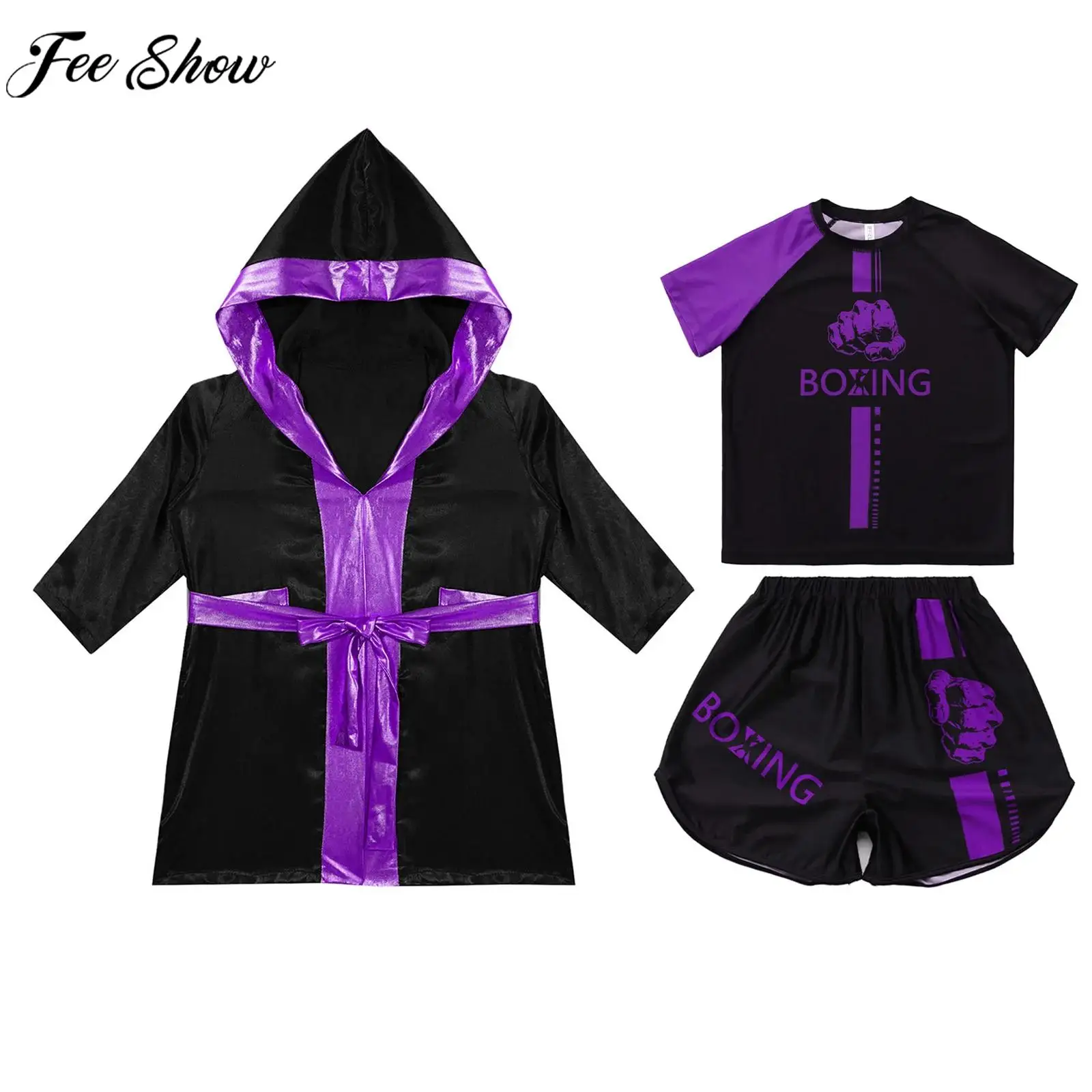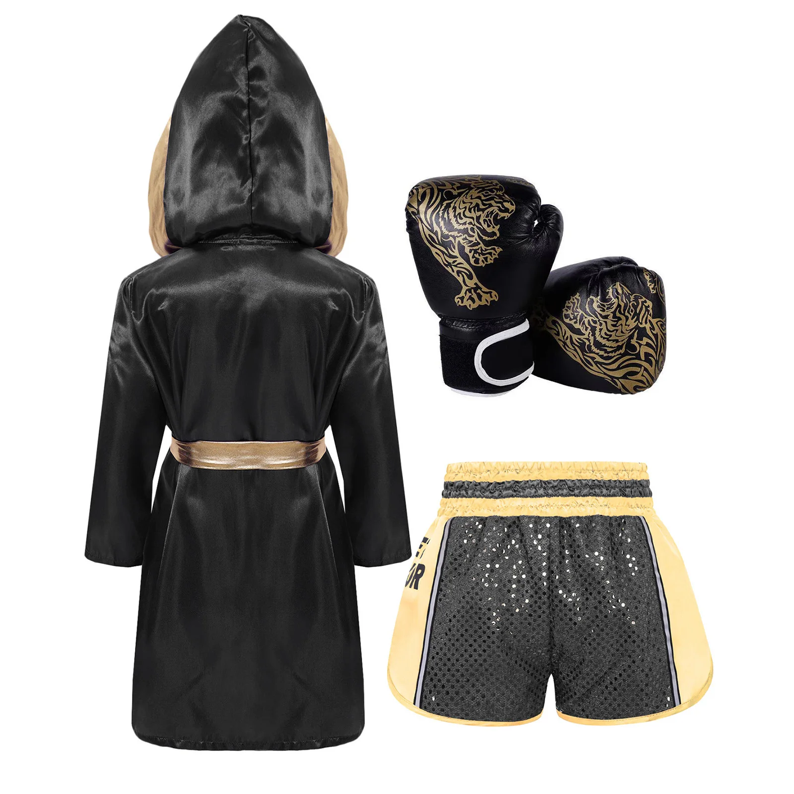 Chlapci dívčí halloween karneval německý boxer cosplais kostým box róba obleček dlouhé rukáv satén pugilism s kapucí plášť s pás šortky