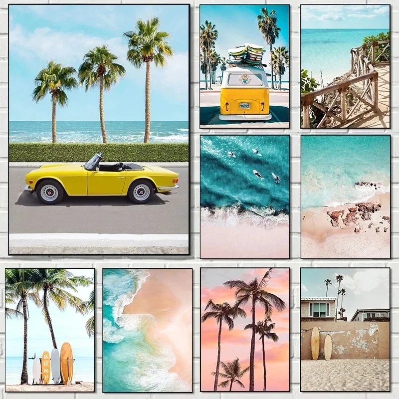 Oceán pláž most zeď umění plátna paintings moře dlaň strom listech autobus plakátů severská žití pokoj otisků obrázky pro domácí dekorace
