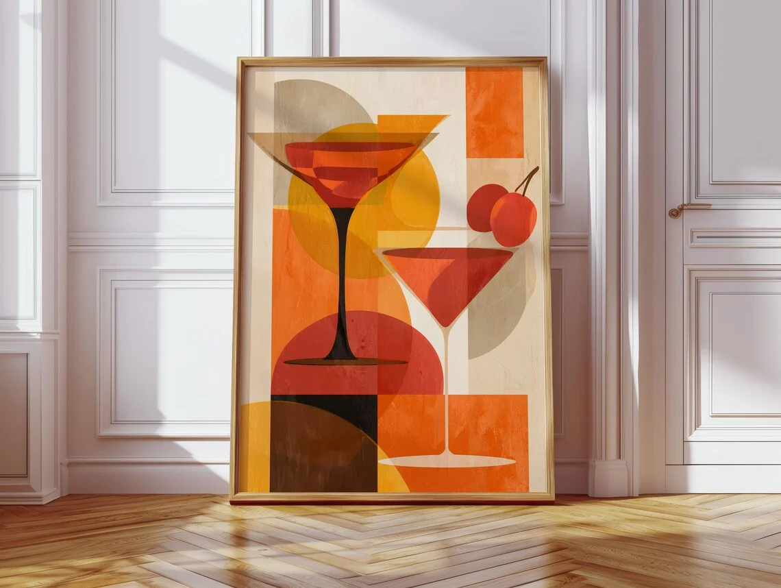 Oranžová retro koktejlové bauhaus tisk, abstraktní plakát, retro japonský plakát, minimalistické tisk, pop umění tisk, ložnice zeď pr
