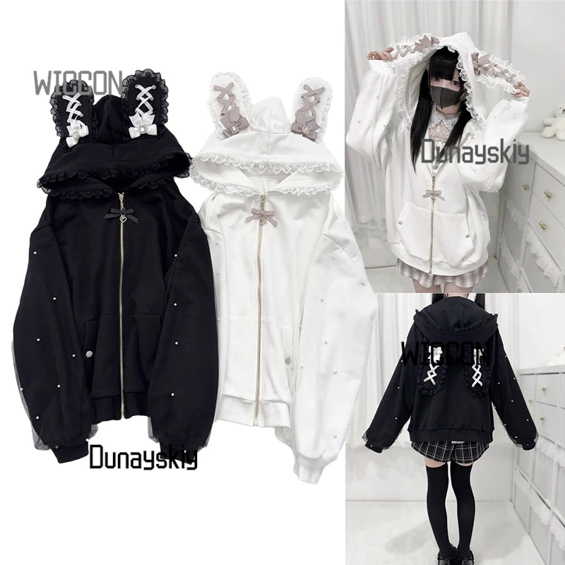 Zajíček mikina mikiny Y2K králík ucho mikina lolita bunda luk dívčí perla JK japonec krajka kawaii na zip svetr dlouhé rukáv nejvyšší