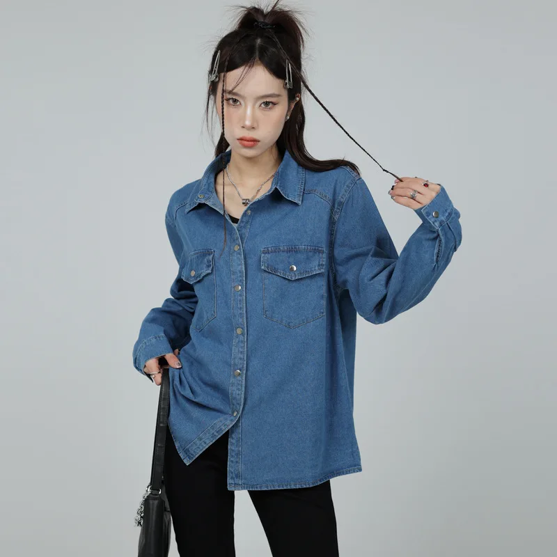 Francouzský vintage džínové s dlouhým rukávem košile. nový jaro a podzim design představovat A ležérní volné klopa košile styl nejvyšší pro ženy