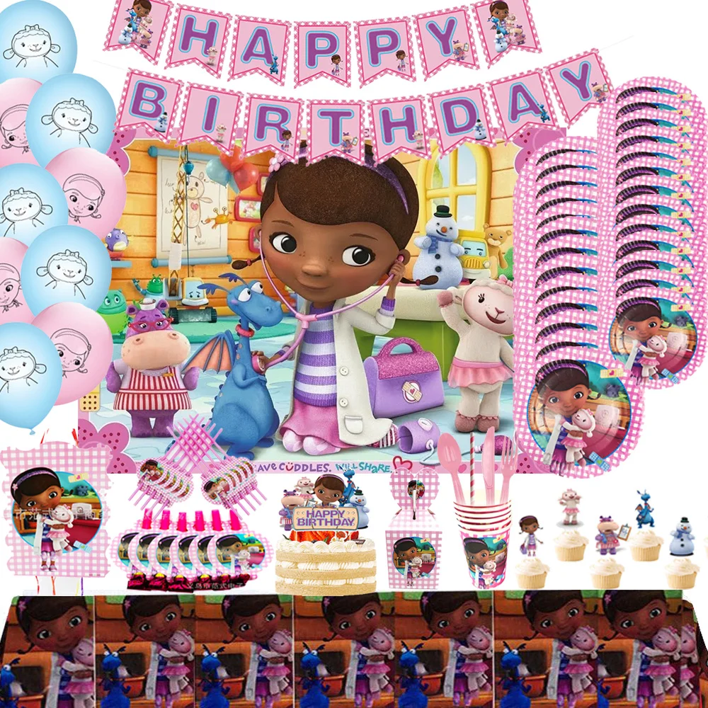 Hračka doktor doc mcstuffins narozeniny večírek dekorace sada jednorázové nádobí balónků pohár talíř pozadí děťátko sprcha zásoby