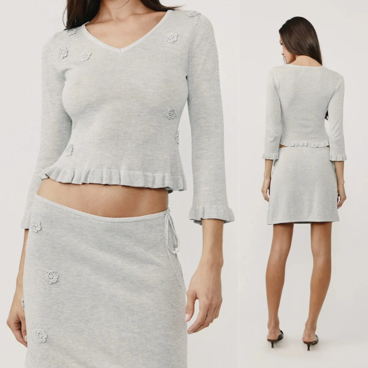 Wj lehký šedá three-dimensional květinová v-neck úplet nejvyšší, dámská tři čtvrtiny rukáv báze topologického prostoru nejvyšší, nabíranou mid-length rukáv slim-fit nejvyšší, jaro a léto ležérní dovolená nejvyšší