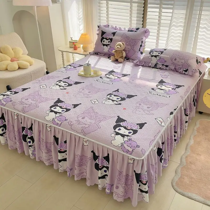 Nový sanrio kawaii anime kuromi roztomilá kreslený kněžna styl prošívaná postel sukně po jednom kusu ošklivý lem postel sukně třídílný sada