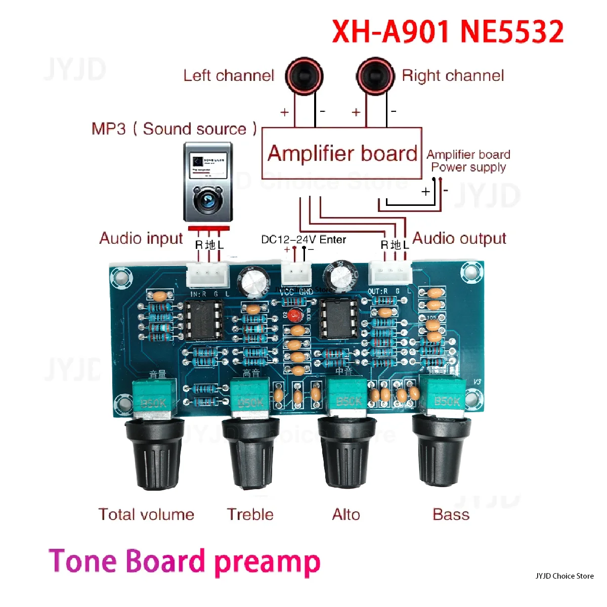 Tónový jazyk deska předzesilovač pre-amp s výšky bas objem nastavovací pre-amplifier tónový jazyk regulátor pro zesilovač deska XH-A901 NE5532