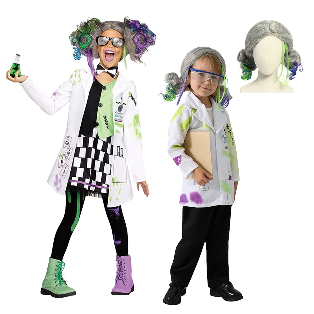 Mateřská škola vědec cosplais kostým bláznivý chemik červen první den slavnost večírek bílá kabát a paruka halloween karneval oblečení sada