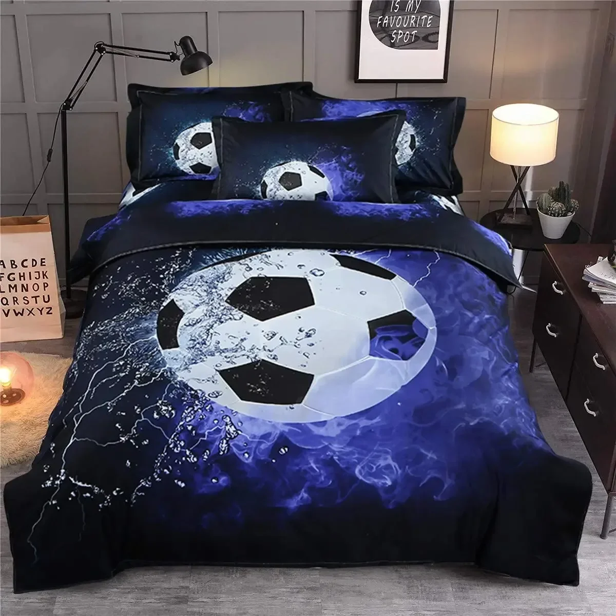Modrá plamen kopaná prošívaná deka zakrýt sada pro dospívající hoch 3D tisk fotbal dusit se zakrýt sada plný rozměr záře a led ložní prádlo sada královna rozměr