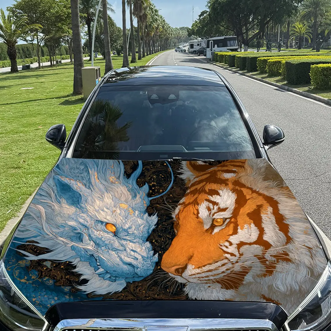 Led - plamen zdvojený drak a tygr tisk auto kapuce nálepky, vodotěsný samolepící, škrábanec odolné, lehko na tyčinka, odolný c