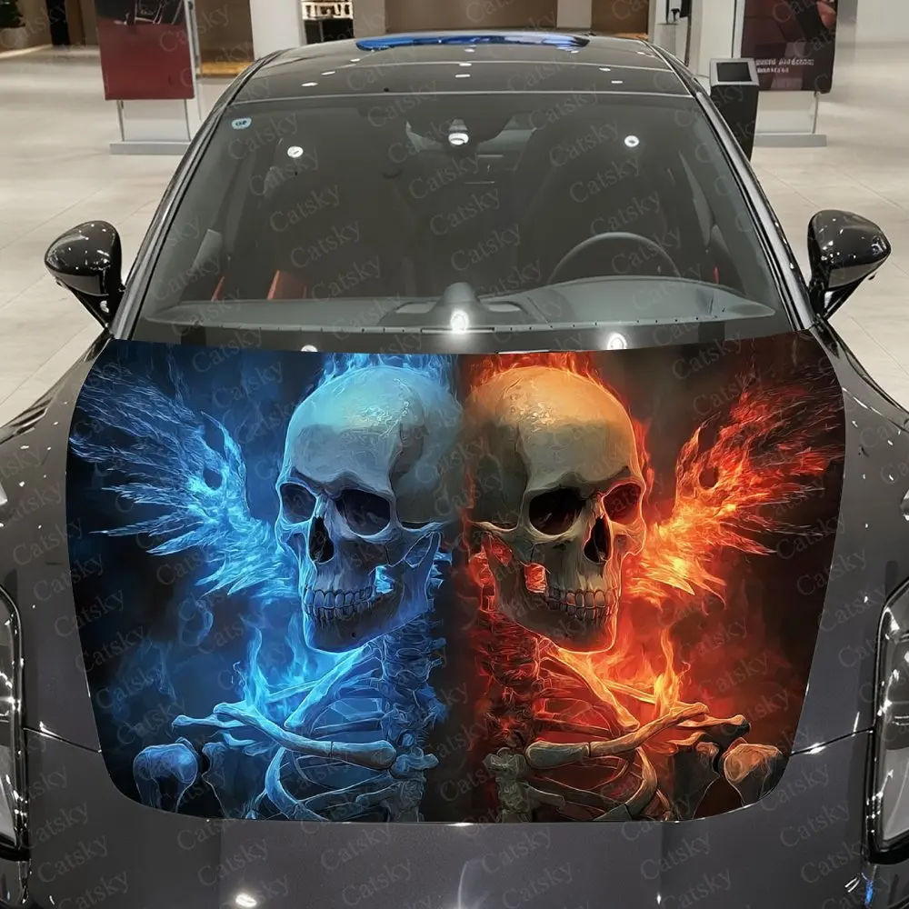 Dvojí skulls ice-flame auto vinyle balit, pvc vodotěsný auto kapuce nálepka, samolepící odolný proti poškrábání nálepky pro motor zakrýt