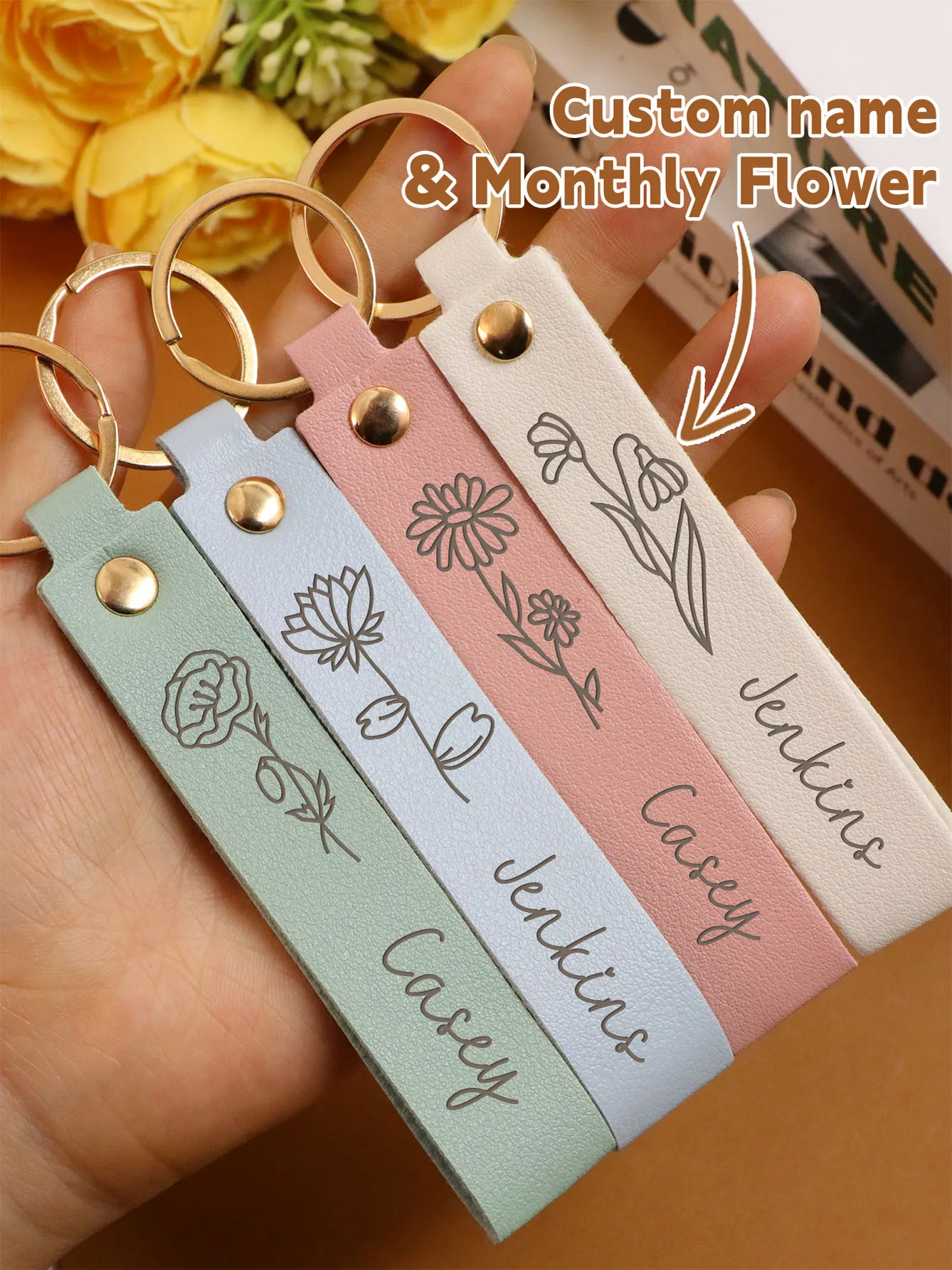 Personalizované PU kůže klíčenka - s narození kvést, párování grafu keychains pro párů, přizpůsobitelné textové roztomilá klíč běžící pás,
