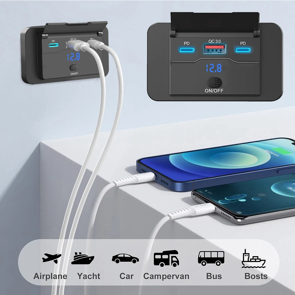 12V 24v auto nabíječka nástrčkový adaptér s spínač elektrické napětí displej PD QC3.0 3-ports nabíjení vývod pro autobus RV ATV kamion loď vývod
