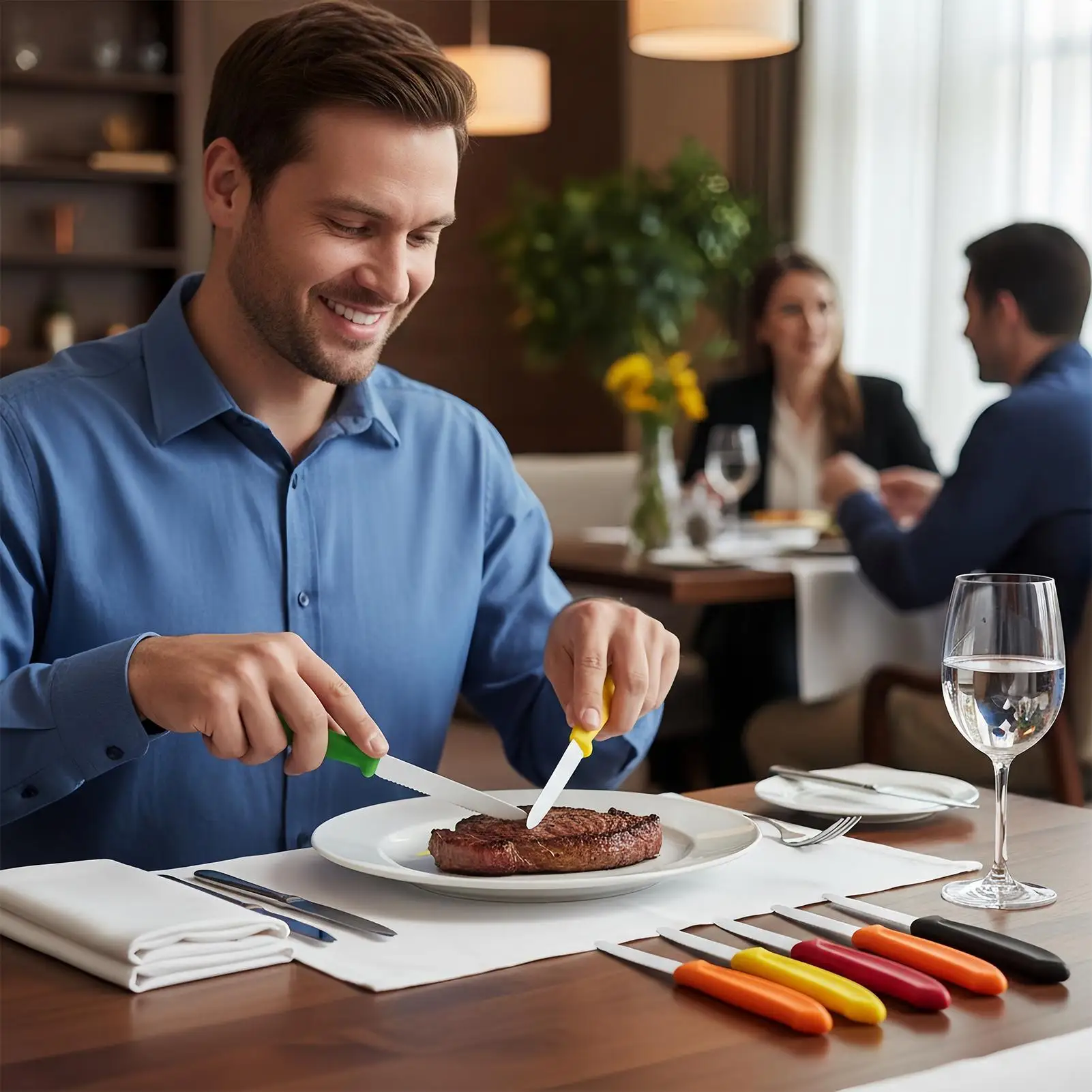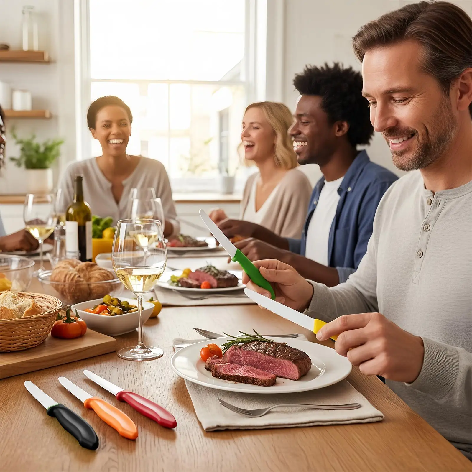 Serrated biftek řezačka 5barvy kousky ergonomická nerez ocel serrated ostrý řezací outdoorové BBQ biftek řezačka sada pro jídlo prep