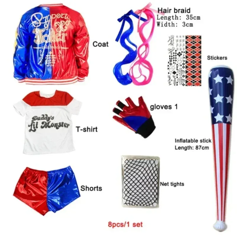 Karneval děti dívčí sebevrah harley cosplais kostýmy oddíl quinn nestvůra joker bunda oblek tetování nálepky kalhot sada