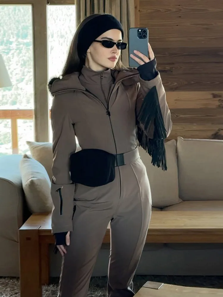 Celistvý s kapucí okrajové lyže kombinéza dlouhé rukáv páskem pás voděodolný 2025 zima módní ženy svrchní móda sněžit oblek