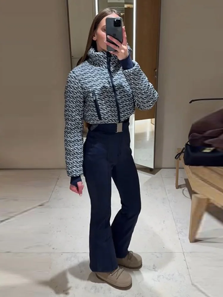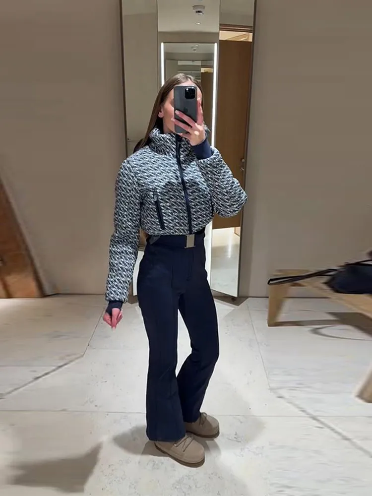 Vodotěsný lyže kombinéza bunda houndstooth dlouhé rukáv zip nahoře 2025 zima kauzální módní ženy svrchní móda sporty teplý kabát