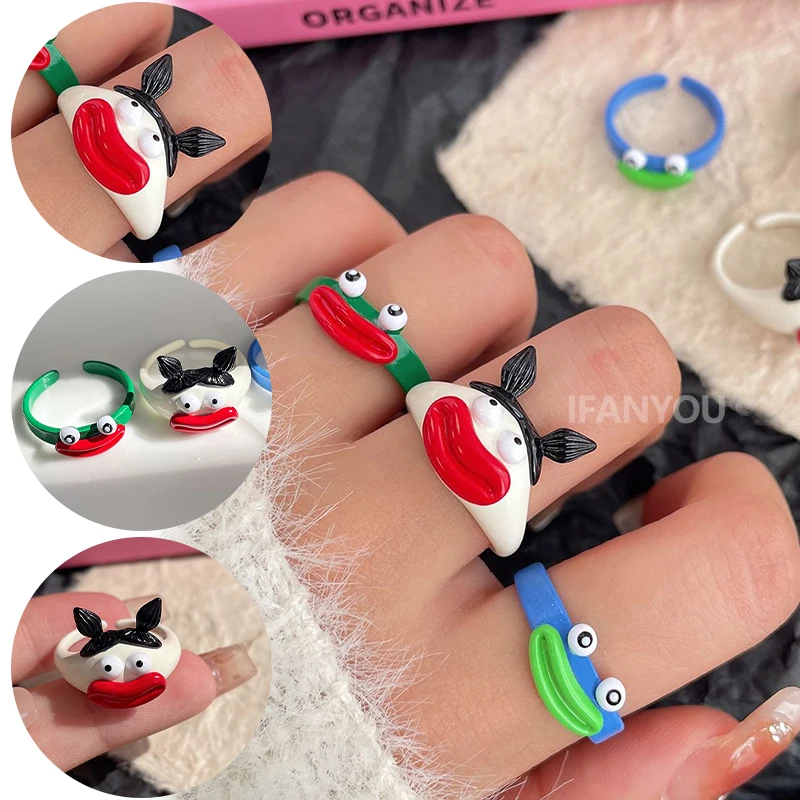 Módní ošklivý roztomilá velký klobása huba žába oči kroužky pro ženy muži dítě móda legrační kreslený otevření prst prsten večírek dar