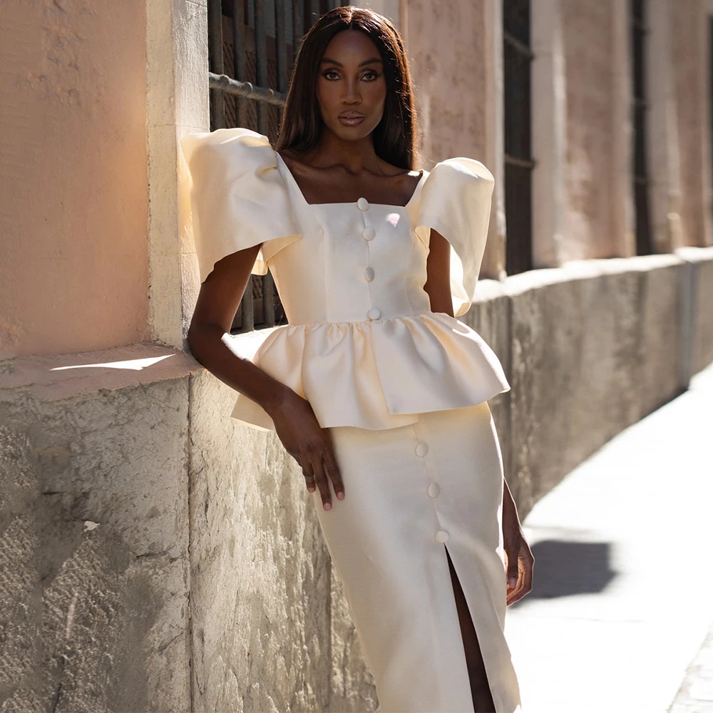 Maßgeschneidertes modernes Cocktailkleid mit kurzen Puffärmeln, quadratischem Ausschnitt, Säulen-Cocktailkleid, Teelänge, gestuftes Satin-Partykleid