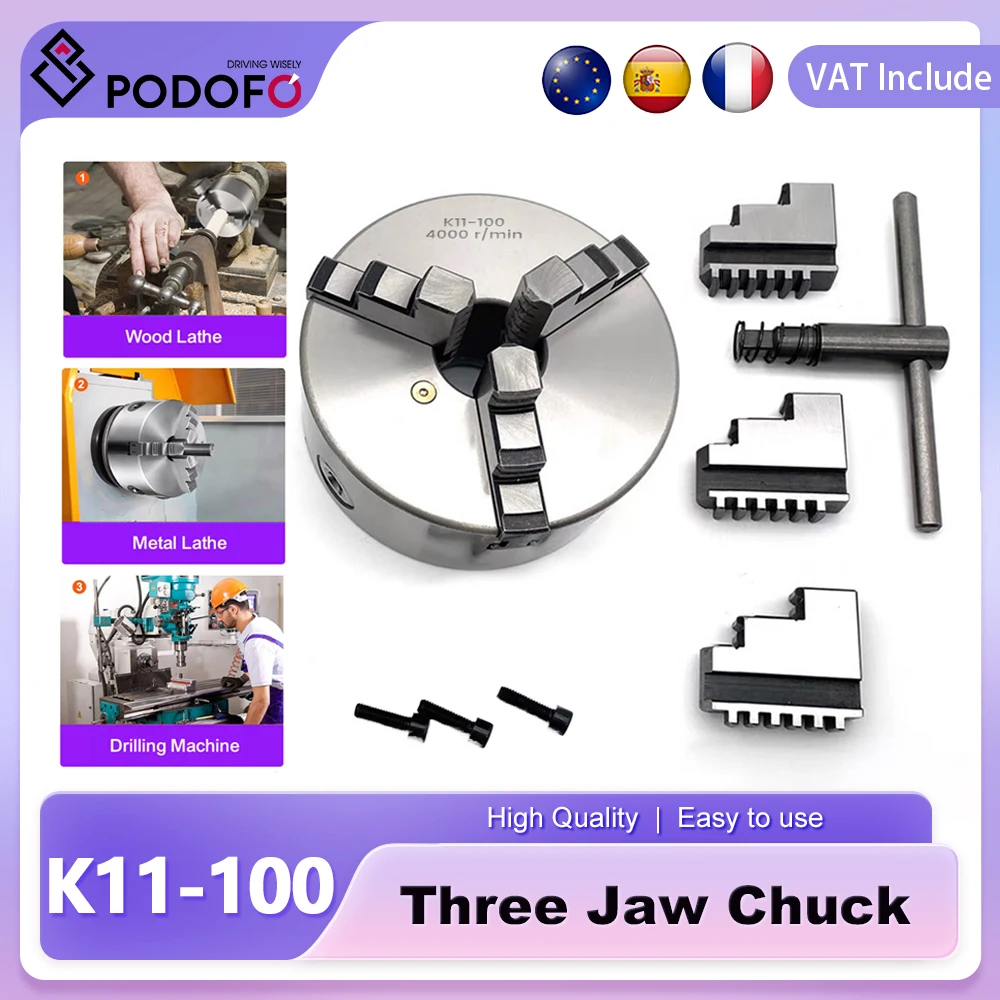 Podofo 100 mm manuelles selbstzentrierendes 3-Backen-Spannfutter K11 60 Nm Drehfutter-Set für CNC-/Fräs-/Bohrmaschinen mit 3 Stück M8-Schraube