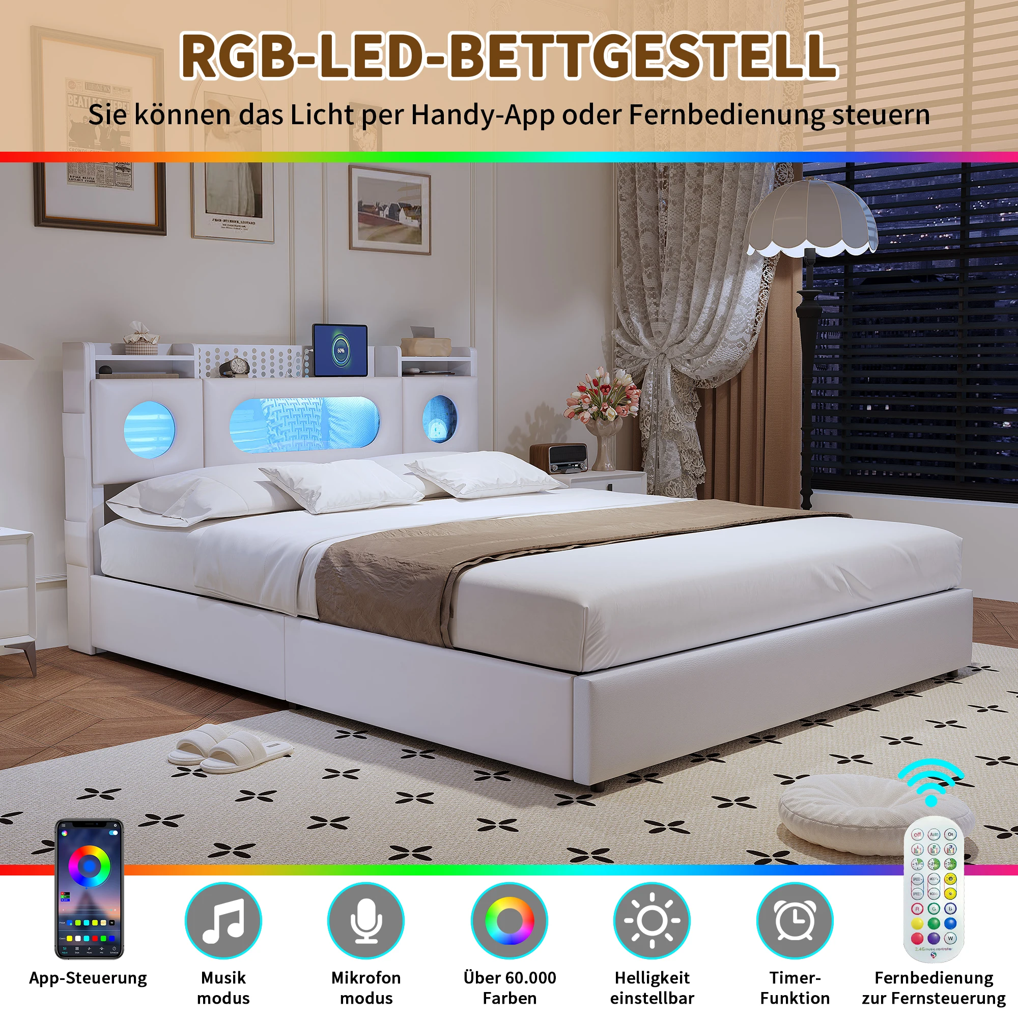Anajqaqia Polsterbett, Hydraulikbett mit Lattenrost, Kopfteil mit USB- und Typ-C-Anschlüssen, Lichtleiste, PU