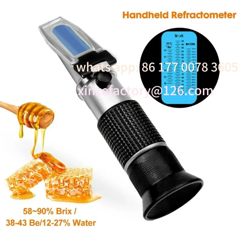 Anpassbares 3-in-1-Hand-Honigrefraktometer, 58–90 % Brix, Zuckerkonzentrationsmessgerät, 38–43 % Baume-Grad, 12–27 % Wassergehalt