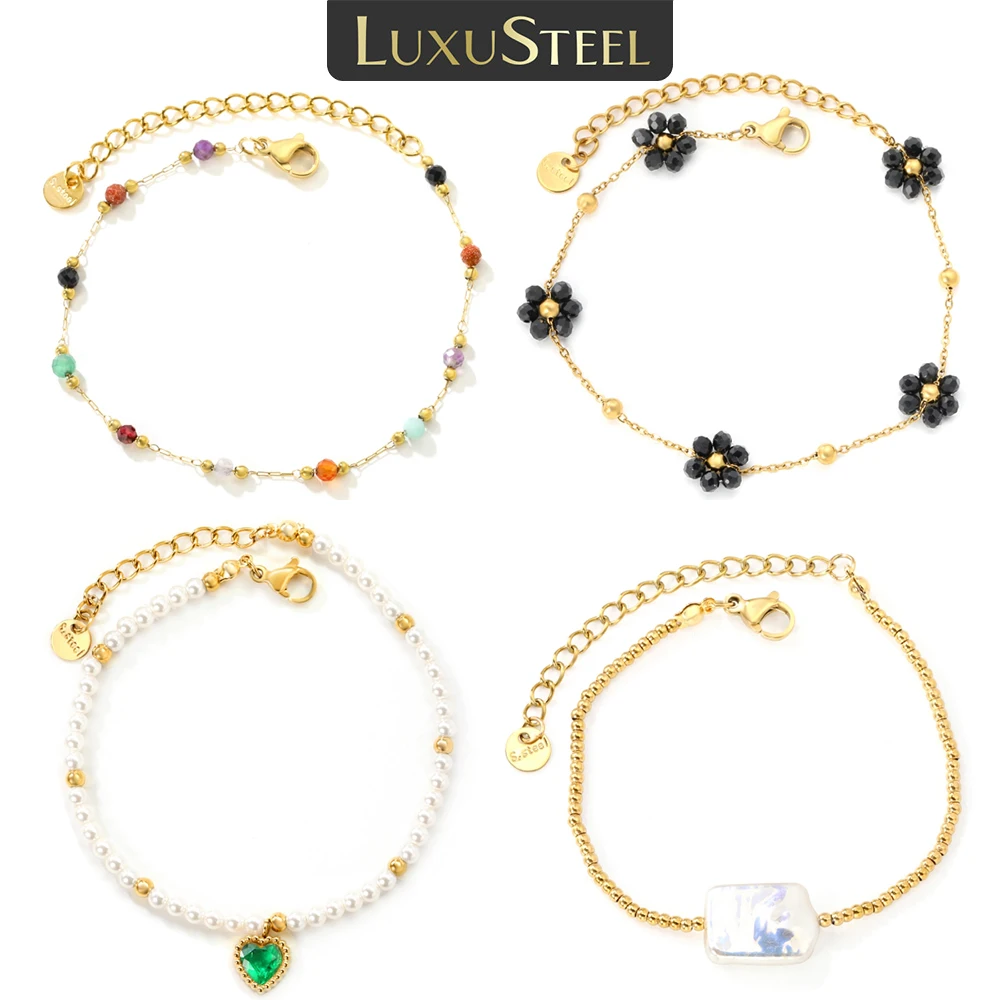 LUXUSTEEL Zierliche Stahlkugel Blume Edelstahl Damen Armband 18 Karat vergoldet Perle Blumenschmuck Hochzeit Damen Armreifen