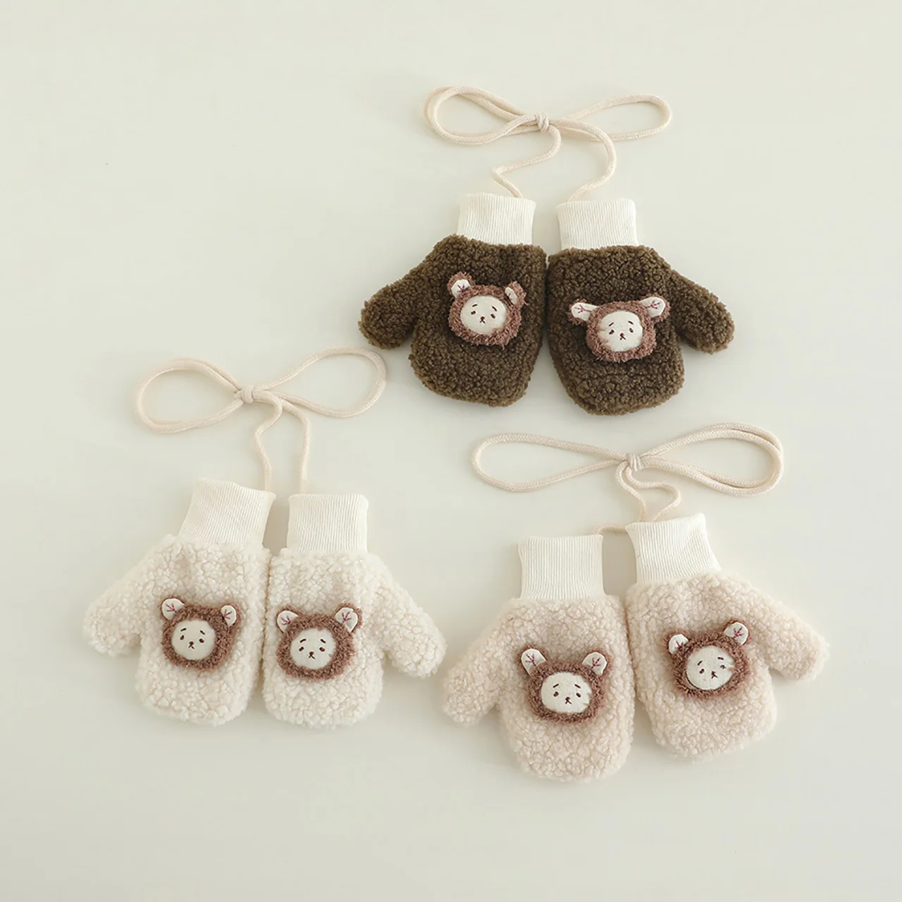 Winter-Lammwollhandschuhe für Babys, niedliche Cartoon-Kaninchen-Fäustlinge, verdickte warme Plüsch-Vollfinger-Handschuhe mit Seilen