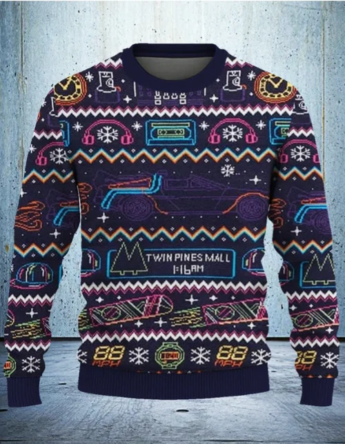 25 Retro-Weihnachtsthema-Stricksweatshirt TWIN PINES MALL „Twin Pine Tree Mall strahlt eine nostalgische Atmosphäre mit 80er-Jahre-Elementen aus