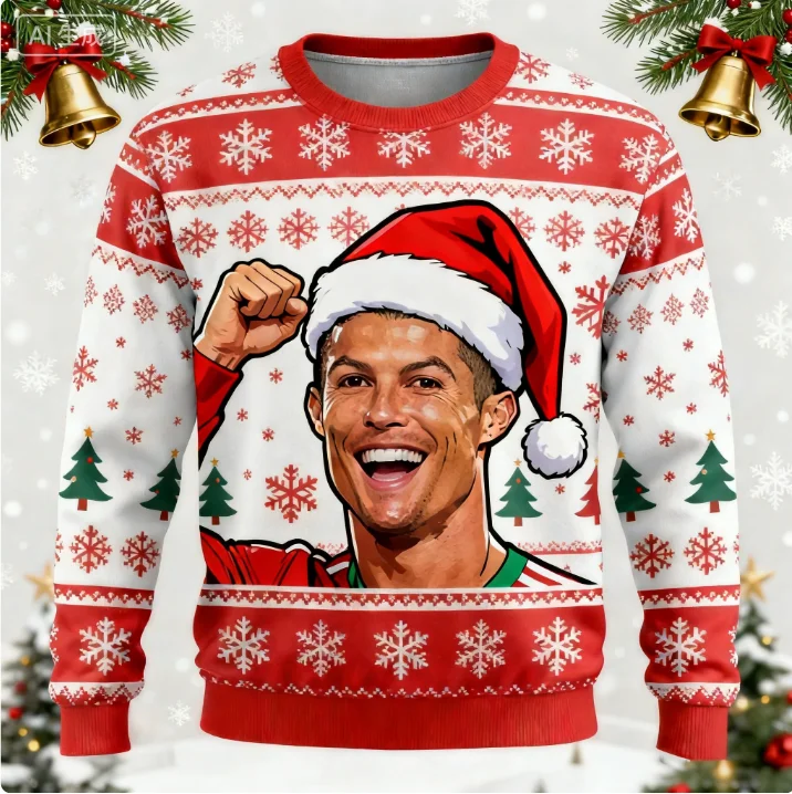 Weihnachtspullover Cristiano Ronaldo: ein festlicher Kampfmantel mit rotem Hintergrund, Schneeflocken und Element 7