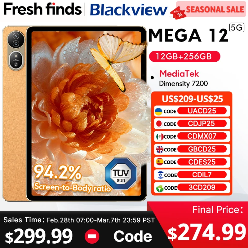 Blackview MEGA 12 Tablet 5G Dimensity 7200 CPU 12,2 Zoll 2,4K 120Hz Display IP69K Wasserdicht 50MP 10000mAh Pad PC