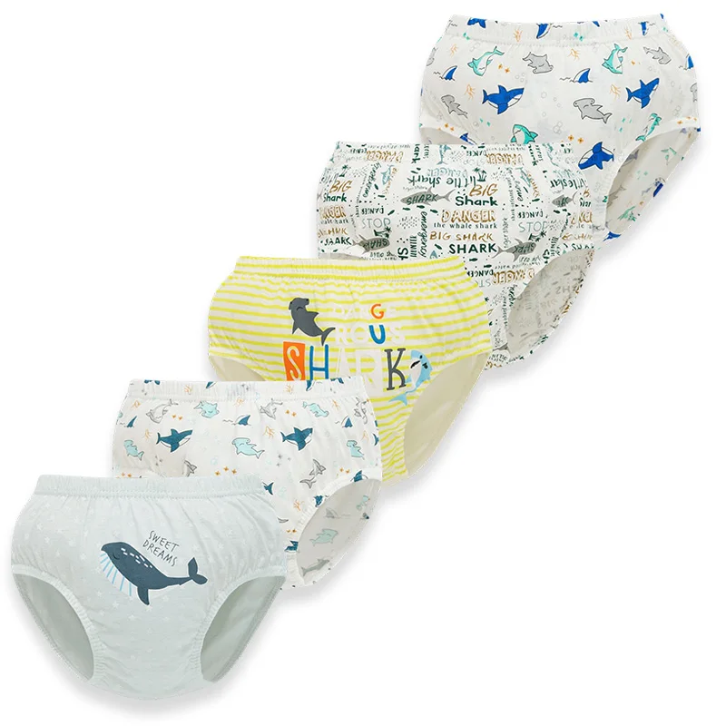 5-teilige Kinder-Dreiecksunterwäsche aus weicher Baumwolle, atmungsaktiv, Jungen-Slip, cooler Hai-Wal-Cartoon-Druck, Kinder-Slip im Alter von 2–13 Jahren