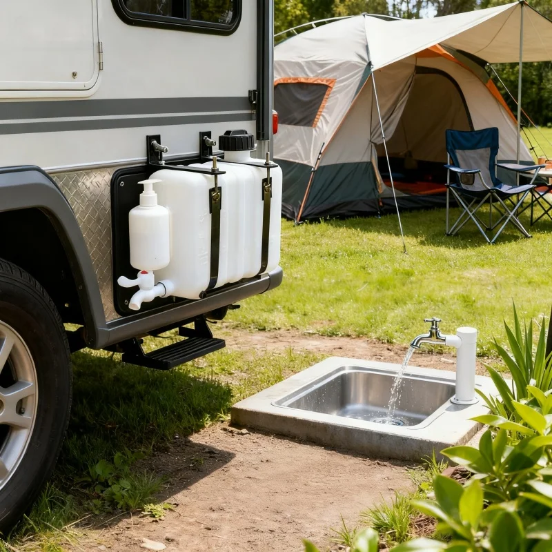 Ein im Fahrzeug montierter 9-Liter-Wassertank mit einem Wasserhahn und einer Halterung zum Händewaschen ist ein rechteckiger Wasserspeichertank