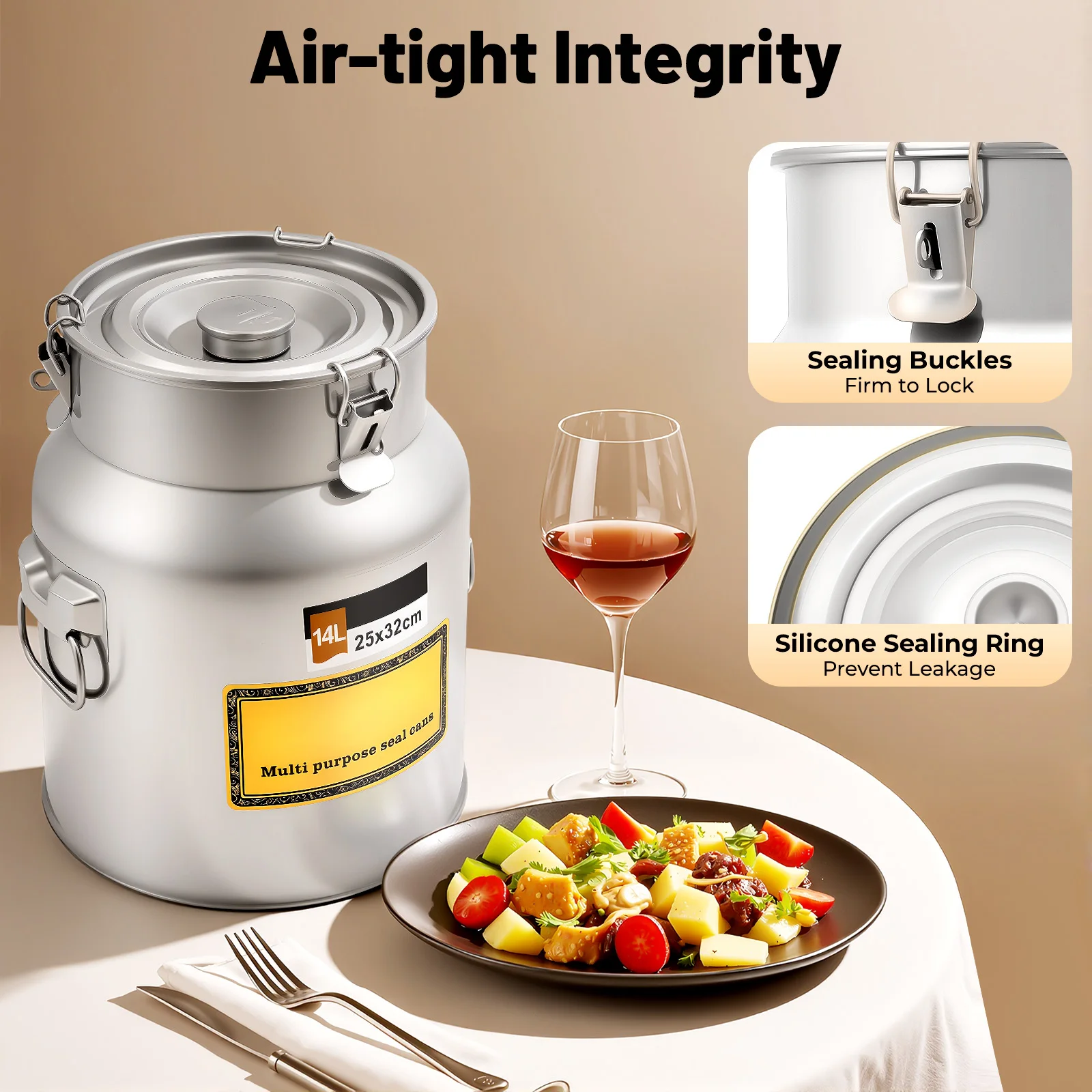 Versiegelter Behälter 201 Edelstahl Luftdichter Milchkrug 14L Lebensmittel-Aufbewahrungsbehälter Mit Weinfächern Geeignet zur Lebensmittelaufbewahrung