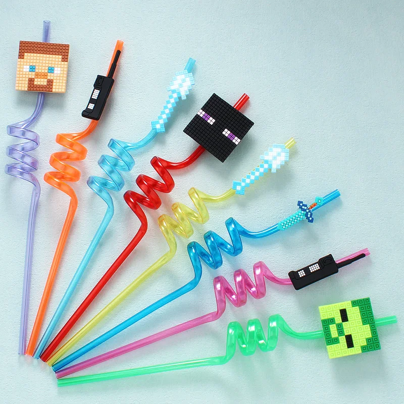 8 Stück My World Strohhalme, wiederverwendbare Spiralstrohhalme, Sommer-Mottoparty, Geburtstagsfeier, Hochzeits-Partyzubehör