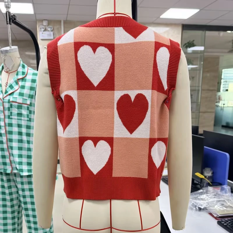 Damen-Pullover mit Herz-Karomuster, V-Ausschnitt, ärmellos, Patchwork-Crop-Strickpullover, stilvolles Weste-Top für den täglichen Gebrauch auf Büro und Party