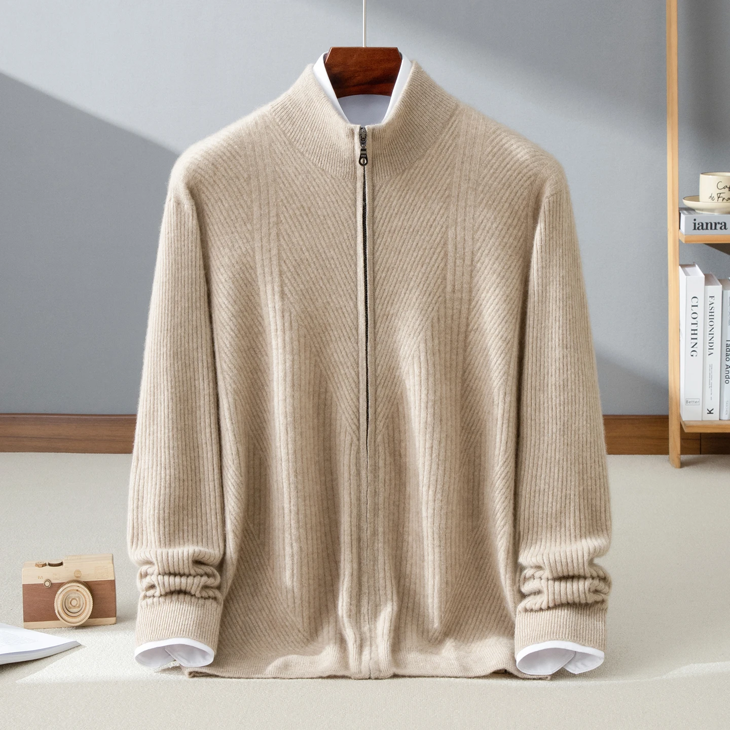 100% Kaschmir Herren-Cardigan Lässiger Gestreifter Strickpullover Luxuriöser Stehkragen Loser Halbhoher Kragen Pullover mit Reißverschluss