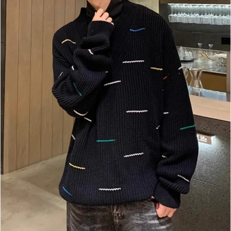 Herren Schwarzer V-Ausschnitt Neuer Strickpullover Buntes Linien-Design Übergroßer Langarm Lässiger Modischer Warmer Pullover