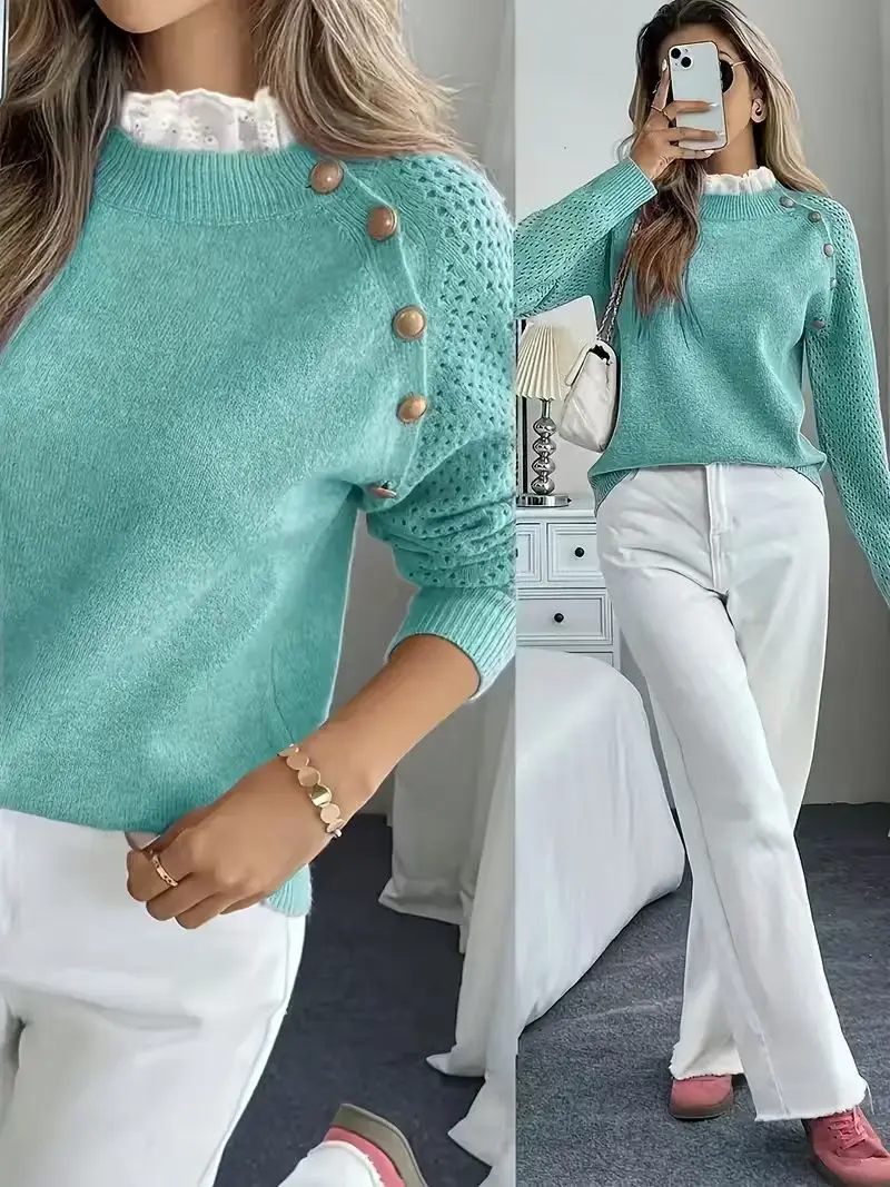 Dressfo 2024 Damen-Oberteil mit offener Schulter, gestrickt, langärmelig, Schnallenriemen, einfarbig, Oberteil, Herbst-Winter-Oberteil