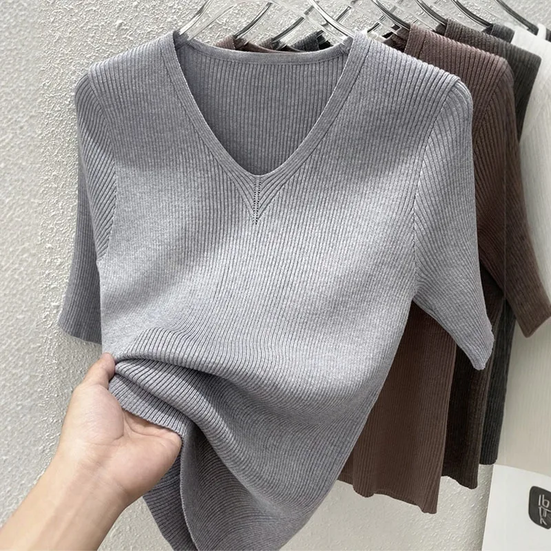 Damen-Pullover Neuer Sommer-Strickpullover Weiße Kurzarm-Strickpullover für Frauen V-Ausschnitt Oberteile 2026 Q3804