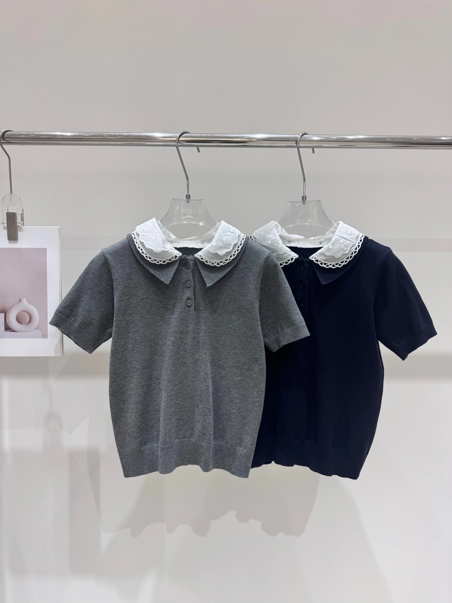 VIBE Preppy Style Babydoll-Kragen-Strick-T-Shirt mit kurzen Ärmeln für Damen, schlankmachendes, jugendliches, vielseitiges Oberteil