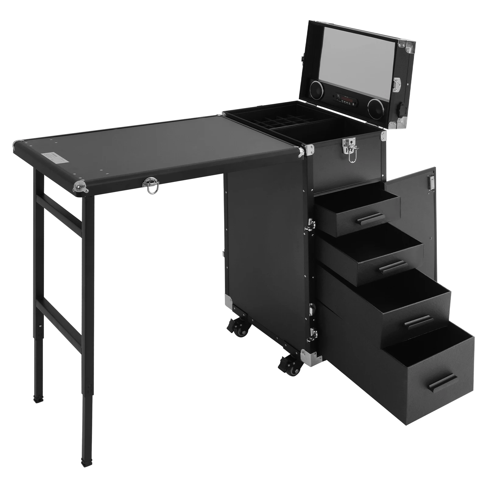 Schwarzer Make-up-Koffer mit Rädern, rollender tragbarer Maniküretisch, zusammenklappbarer Kosmetik-Organizer, multifunktionale Nagelkünstlerstation