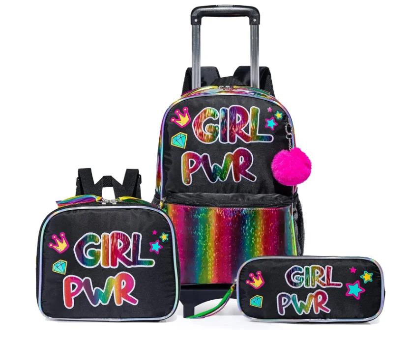 Schulrucksack-Taschen-Set mit Rollen für Mädchen, Schüler, Rollrucksack, Schultrolley-Taschen mit Lunchbox für Mädchen, Trolley