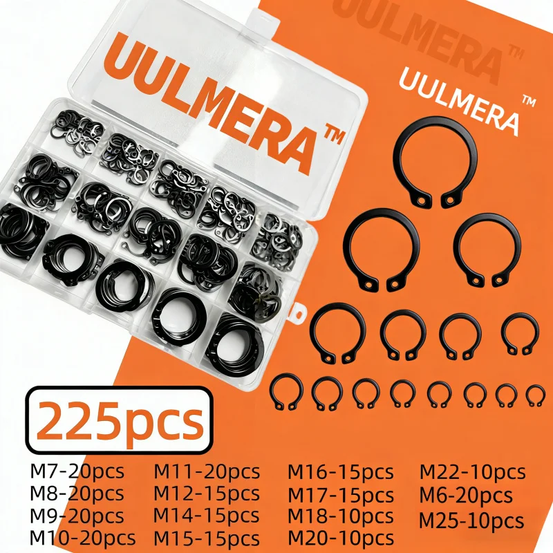 UULMERA 225-teiliges Achssicherungsring-Set Enthält 15 Größen (6mm bis 25mm) Schwarze Manganstahl Externe Sicherungsringe