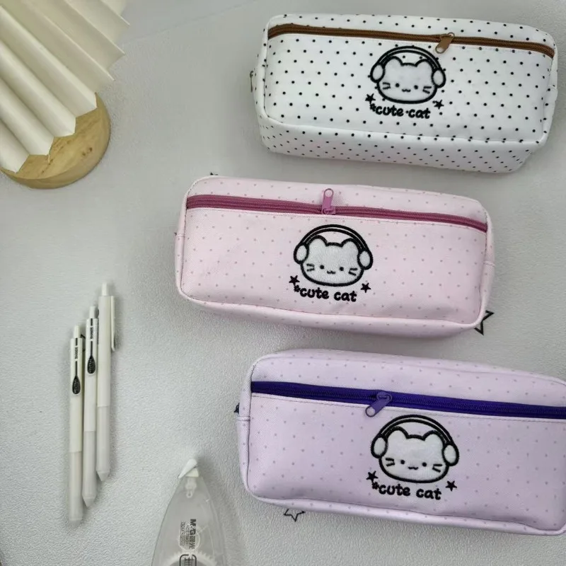 Minimalistisches Federmäppchen im Cartoon-Ins-Stil, großes Fassungsvermögen, gepunktete Make-up-Tasche, süße Katze, Kopfhörer, Schreibwaren-Organizer für die Schule
