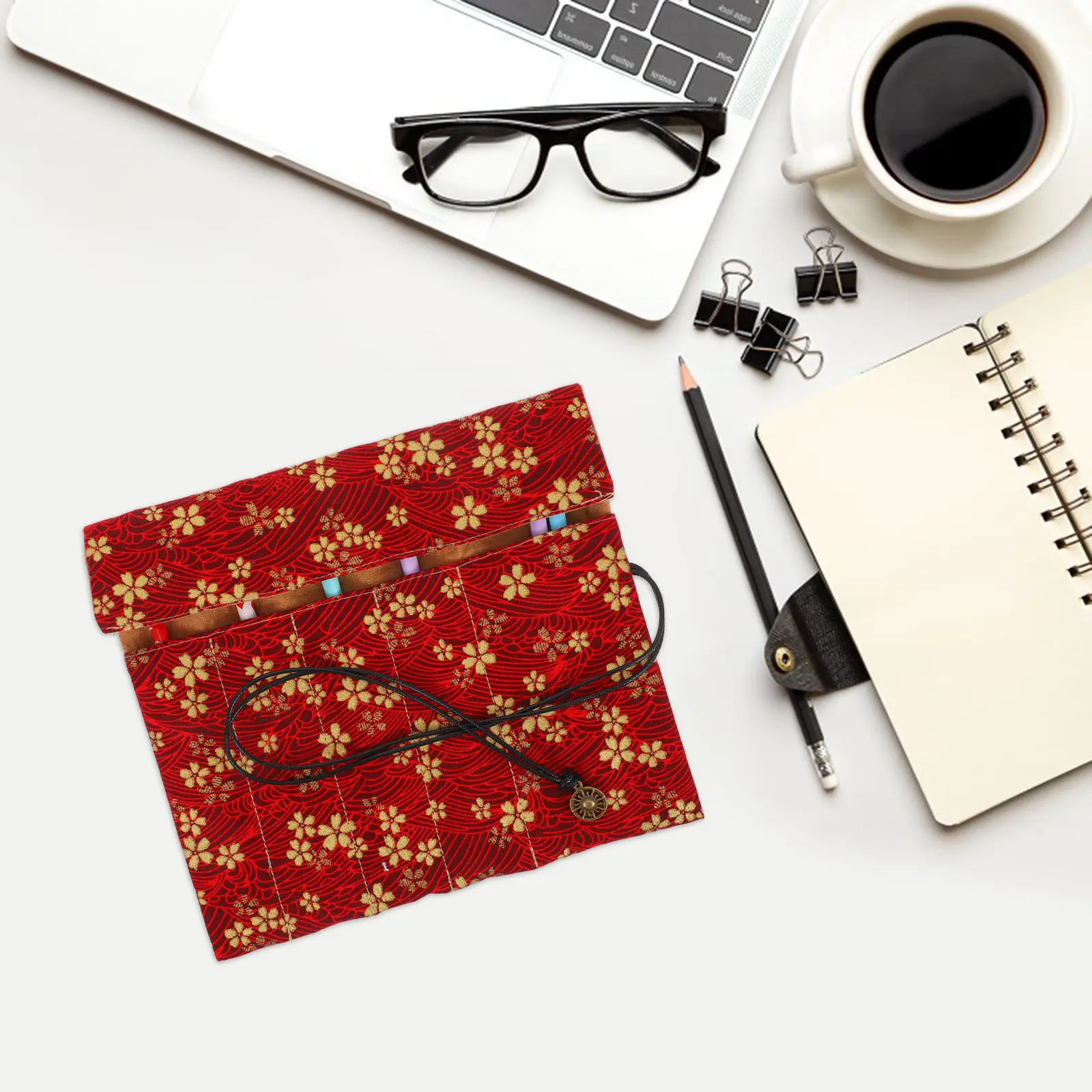 Rollbares Federmäppchen im Vintage-Stil mit goldenem Blumenmuster, Aufbewahrungstasche für Stifte, tragbarer Organizer für Frauen