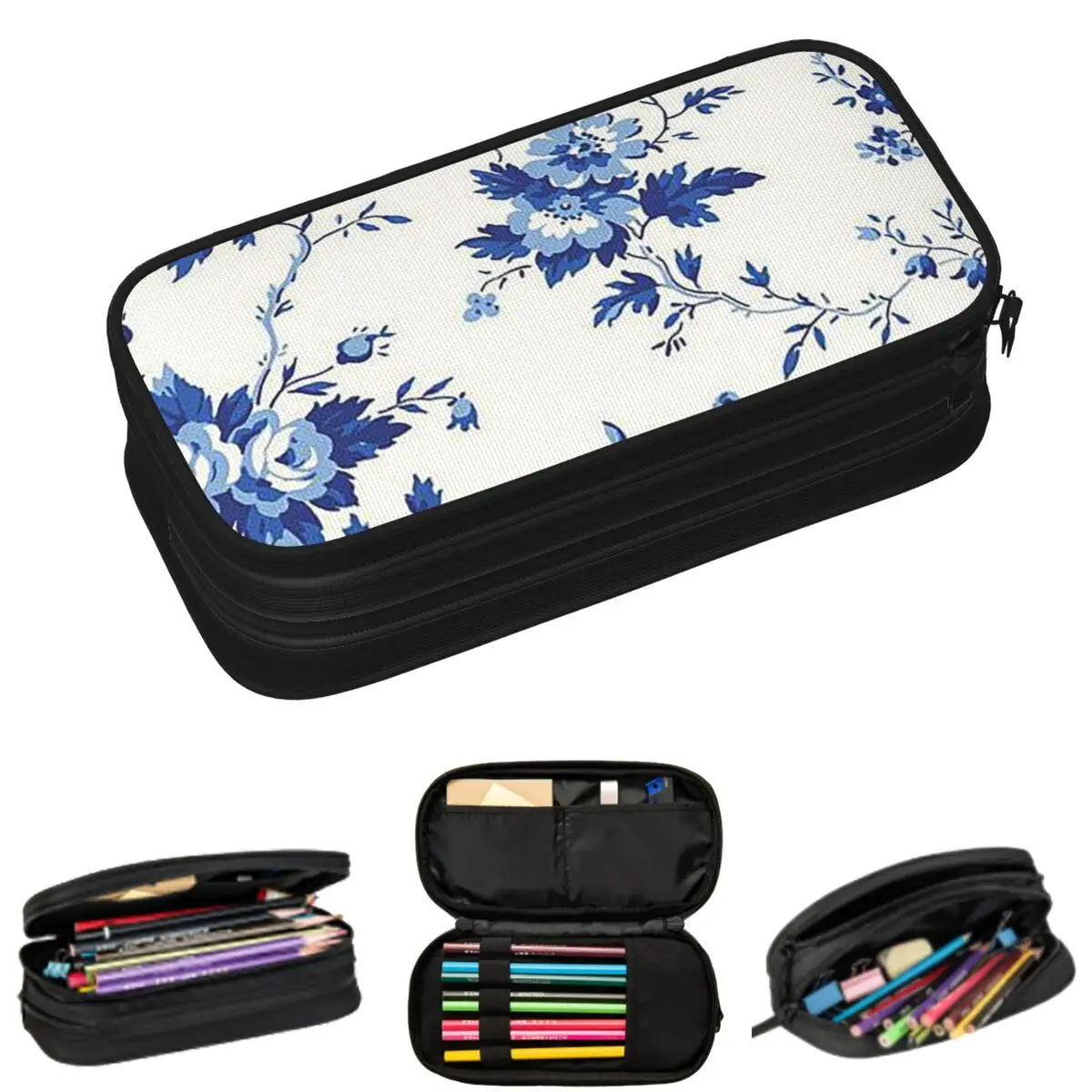 Blaue Blumenmuster-Federmäppchen für Schüler, Stiftbox, große Aufbewahrungstasche für Stifte